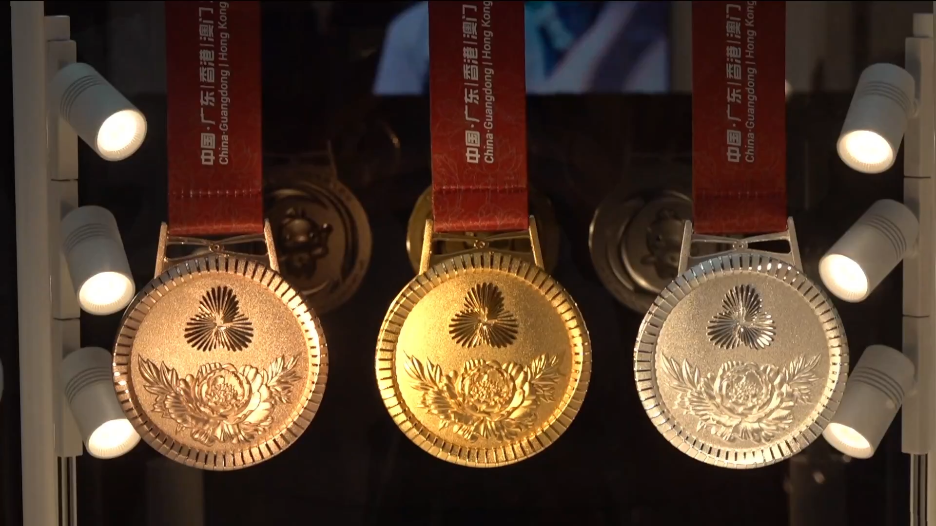 值得一提的是,本屆競體項目獎牌的會徽面首次採用無文字設計,純以圖案敘事:同心禮花由下方的牡丹托舉,生動詮釋了粵港澳大灣區在祖國的堅實依託下蓬勃發展,綻放於世界舞台,呈現「三花映牡丹,盛世綻芳華」的美好景象。