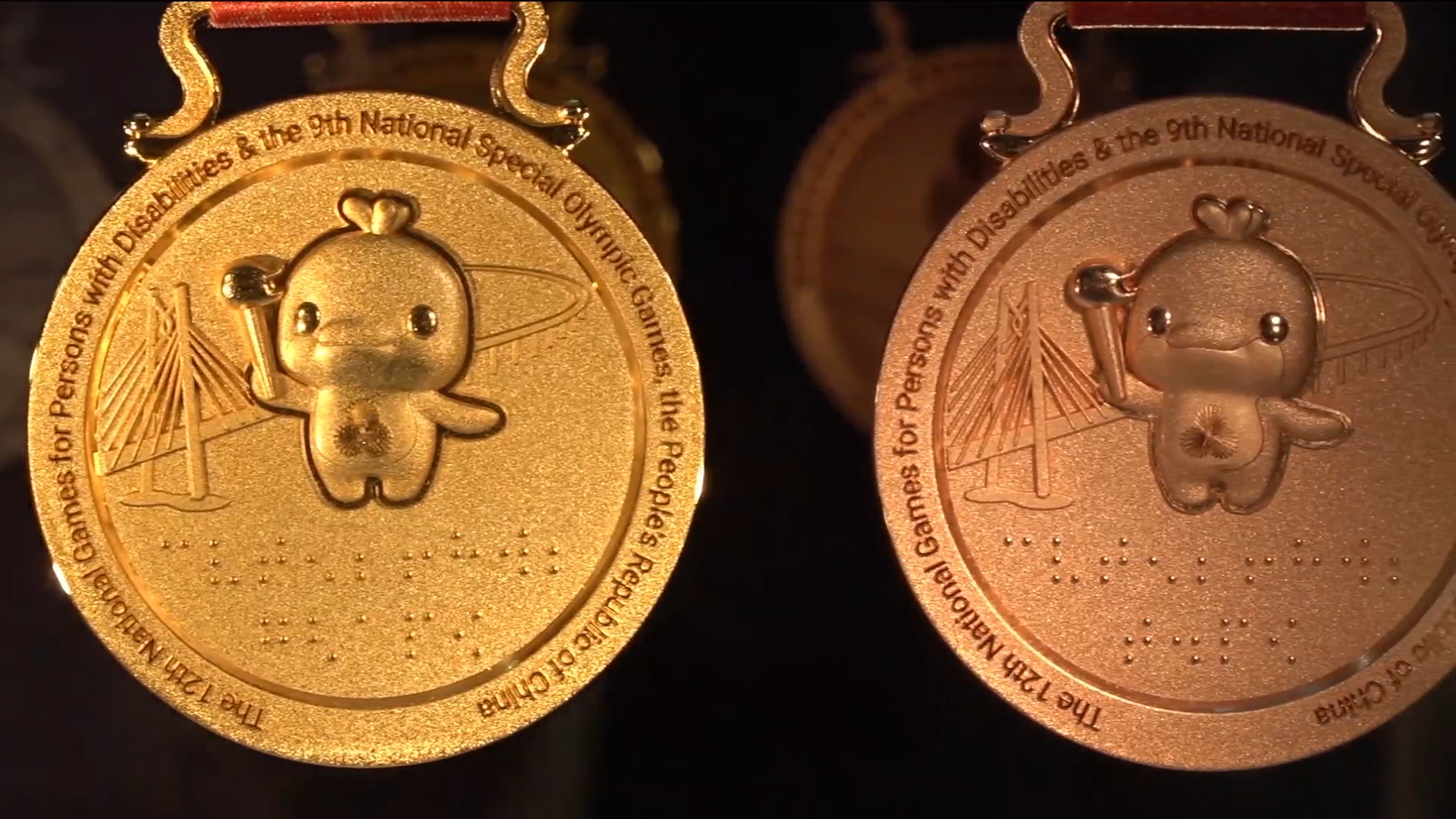 更引人注目的是,浮雕下方創新嵌入盲文,第一行鐫刻「殘特奧會」,第二行分別對應獎牌標註「金牌」「銀牌」「銅牌」,讓視障運動員可通過觸摸感知榮譽,彰顯賽事對特殊群體的細緻關懷。背景中的港珠澳大橋是圓夢橋、同心橋、復興橋,體現逢山開路、遇水架橋的奮鬥精神。