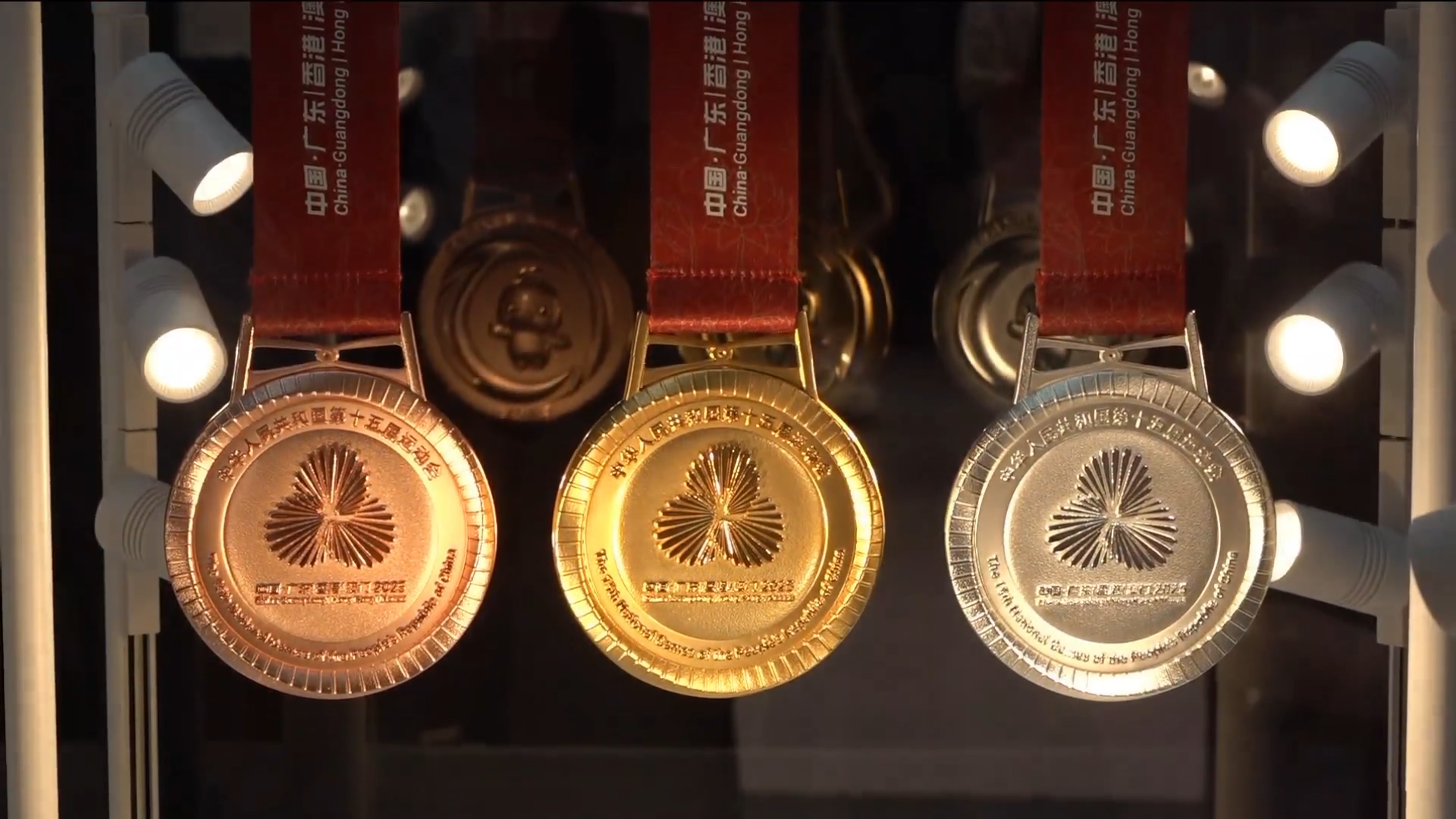 11月,在粵港澳三地聯合舉辦的第十五屆全國運動會(十五運會)上,「同心躍」將見證全國運動員的夢想時刻。緞帶顏色以「中國紅」為基調,競賽項目獎牌採用「三花映牡丹」概念,獎牌上方是由代表廣東省、香港及澳門三地的木棉、洋紫荊、蓮花花瓣交疊旋轉形成同心禮花,下方則為象徵中國的牡丹花。