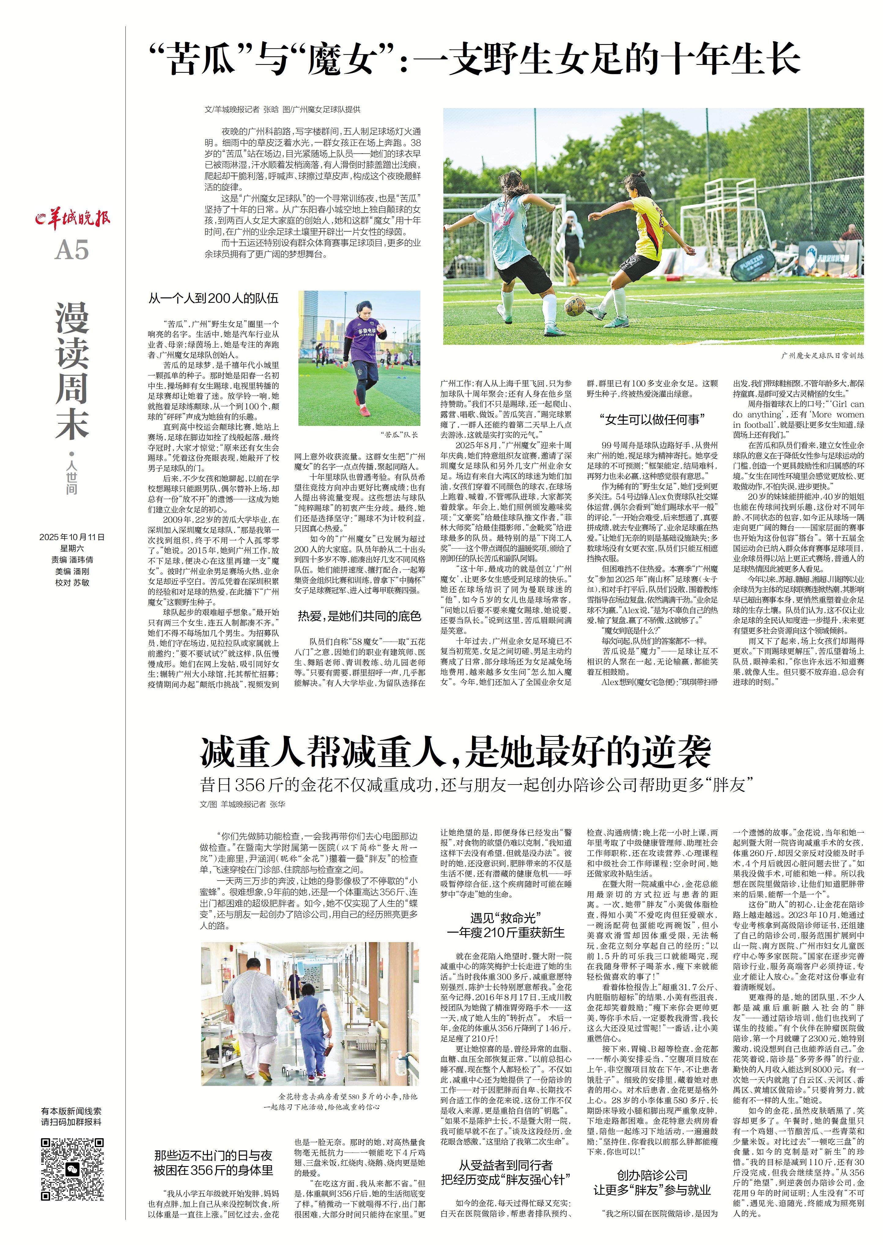 “这十年,最成功的就是创立‘广州魔女’,让更多女生感受到足球的快乐。”她还在球场结识了同为曼联球迷的“他”,如今5岁的女儿也是球场常客,“问她以后要不要来魔女踢球,她说要,还要当队长。”说到这里,苦瓜眉眼间满是笑意。