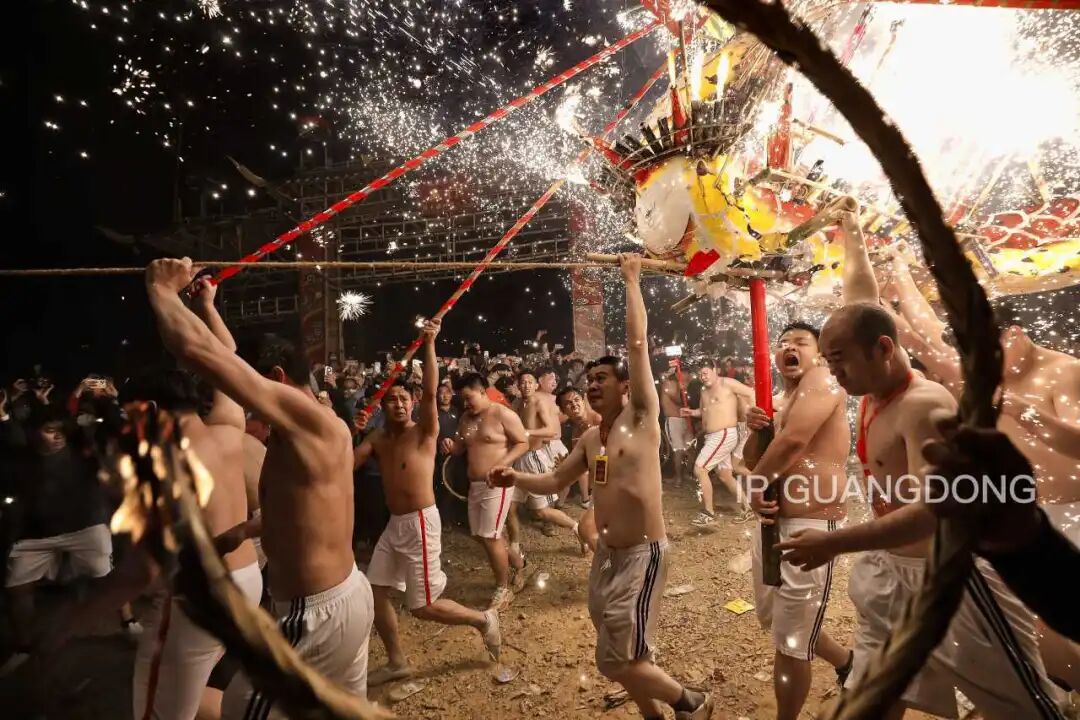 队员们赤膊上阵,在烟花爆竹中舞动,十分震撼。