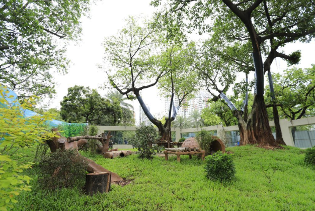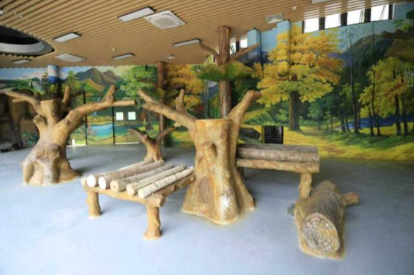 室外活动场充分模拟大熊猫自然栖息环境,地形高低起伏,有乔木、灌木和草坪,配合栖架、滑梯、倒伏树木、饮水池、戏水池等丰容设施,形成一片绿荫环绕、平坦开阔的“花园”。此外,参观面采用的特种玻璃具有保温、降噪、防雾功能,为大熊猫创造宁静舒适的生活玩耍空间。