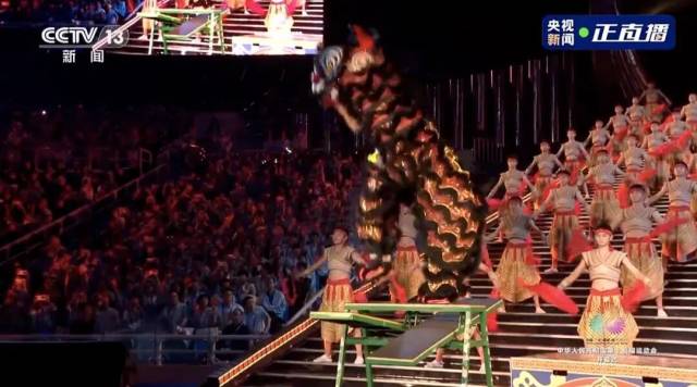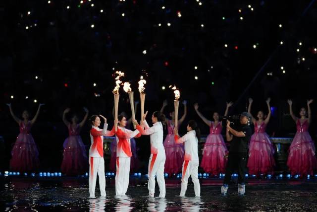 场内火炬传递环节,马琳、陈若琳、郭晶晶、冼东妹、容志行、中国香港运动员黄金宝、中国澳门运动员方文浩等来自全国各地的火炬手“踏浪”而来,步履铿锵,将凝聚粤港澳三地深情的“同心之火”,交到来自粤港澳三地的点火火炬手苏炳添、张家朗、李祎手中。
