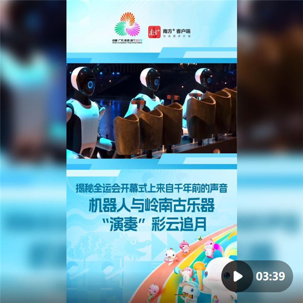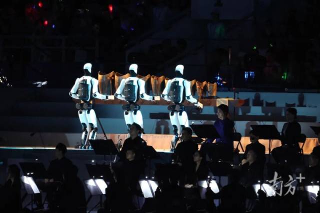 象征粤港澳三地的三个机器人整齐划一地“敲响”铜句鑃仿制品,舞台上响起《彩云追月》的动人音符。