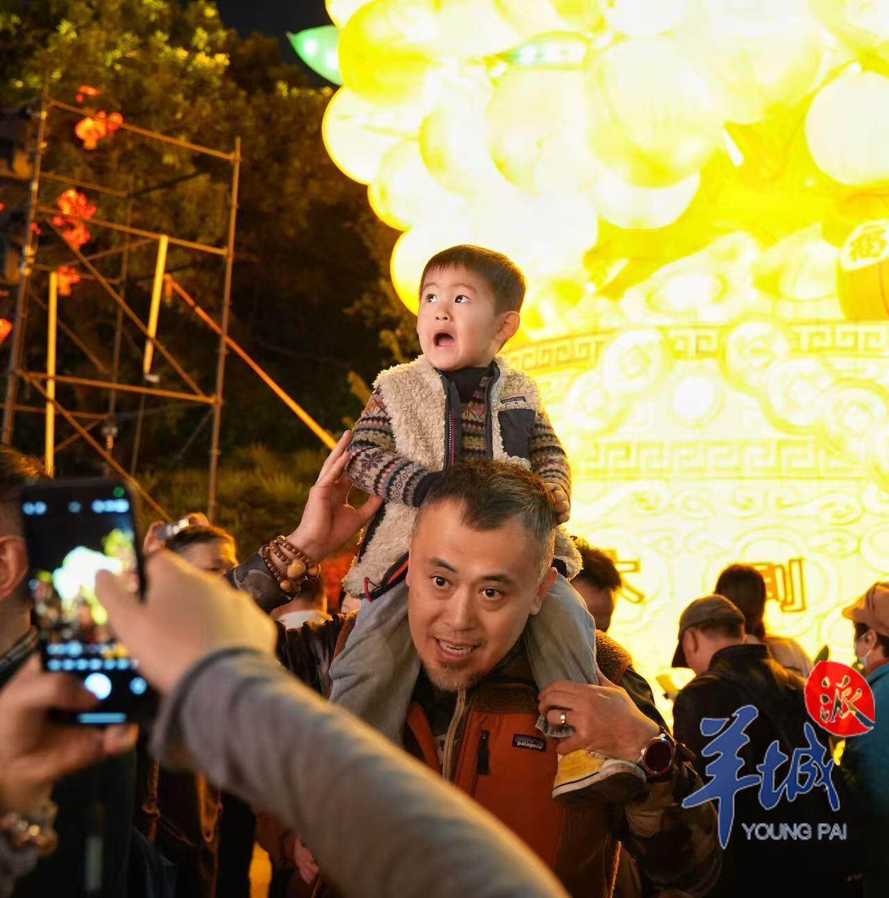 “哇,好靓!”越秀公园正门处舞台前人潮涌动,粤剧声声、热闹非凡。高20米、超七层楼高的巨型凤冠灯饰栩栩如生,配合着护背旗、粤剧乐器、戏曲人物等元素,以迎宾之姿展现岭南文化的雍容风采,光影折射间也揭开了中国年的华美序章。